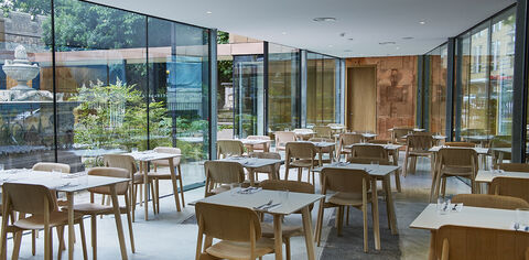 Located in an impressive glass and beaten-bronze pavilion, the restaurant space was designed by Dow Jones Architects, with additional internal layout and design by Tom Benton Architects. The interiors are inspired by its leafy and calming surroundings and on sunny days the courtyard garden is a delightful space to enjoy a fabulous lunch.