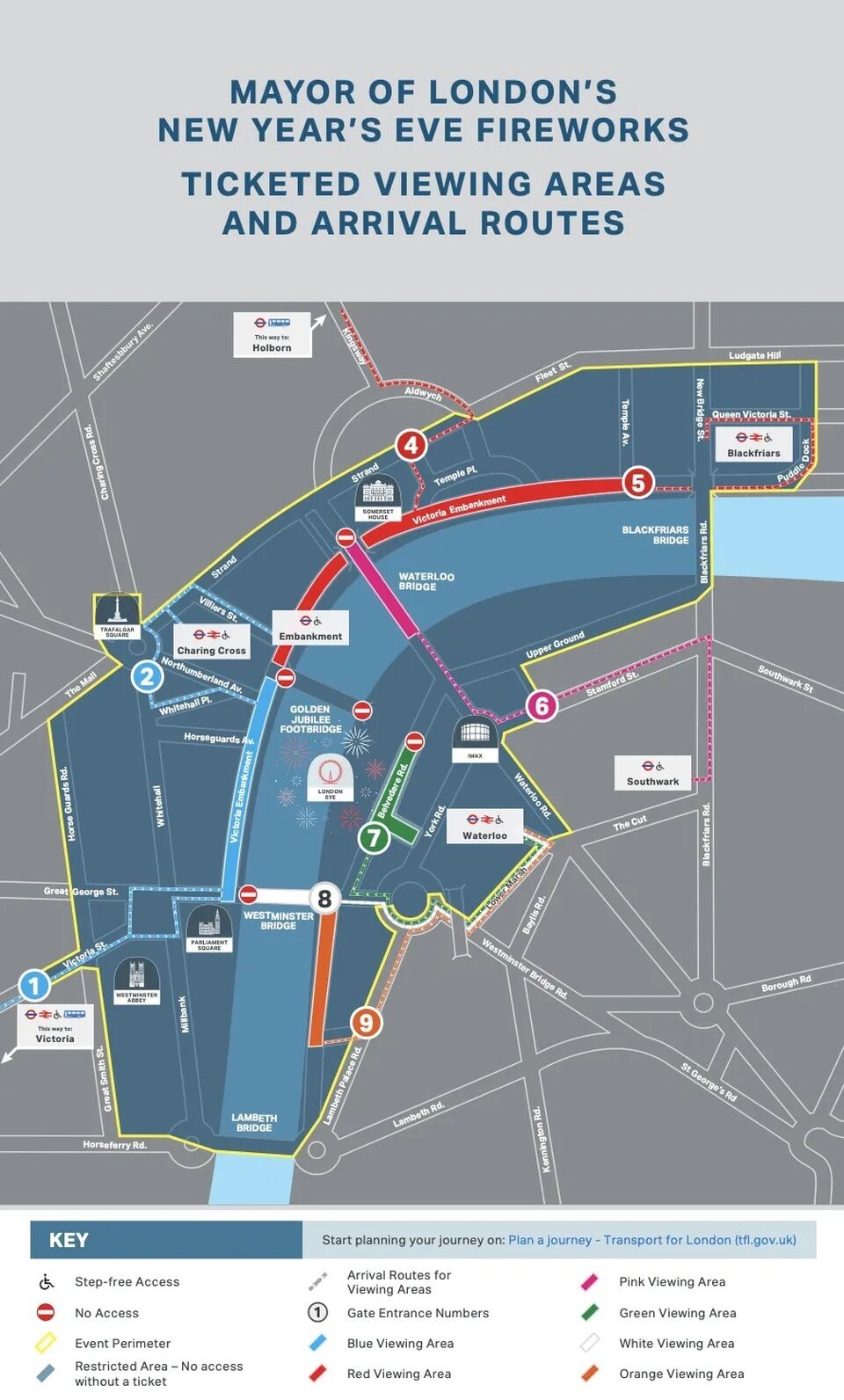 To ensure the safety of the event, access to the dedicated viewing areas in and around the South Bank is ticketed.