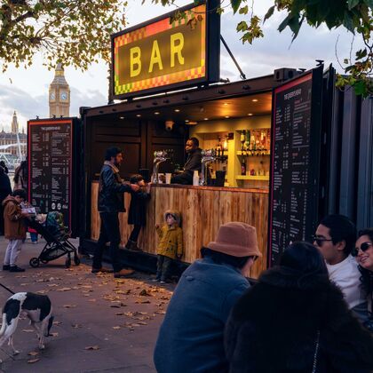 Stretching along the promenade underneath Hungerford Bridge between the Royal Festival Hall and Jubilee Gardens, there’s plenty to feast on with a wide array of wintery pop-up bars and delicious street food stalls.